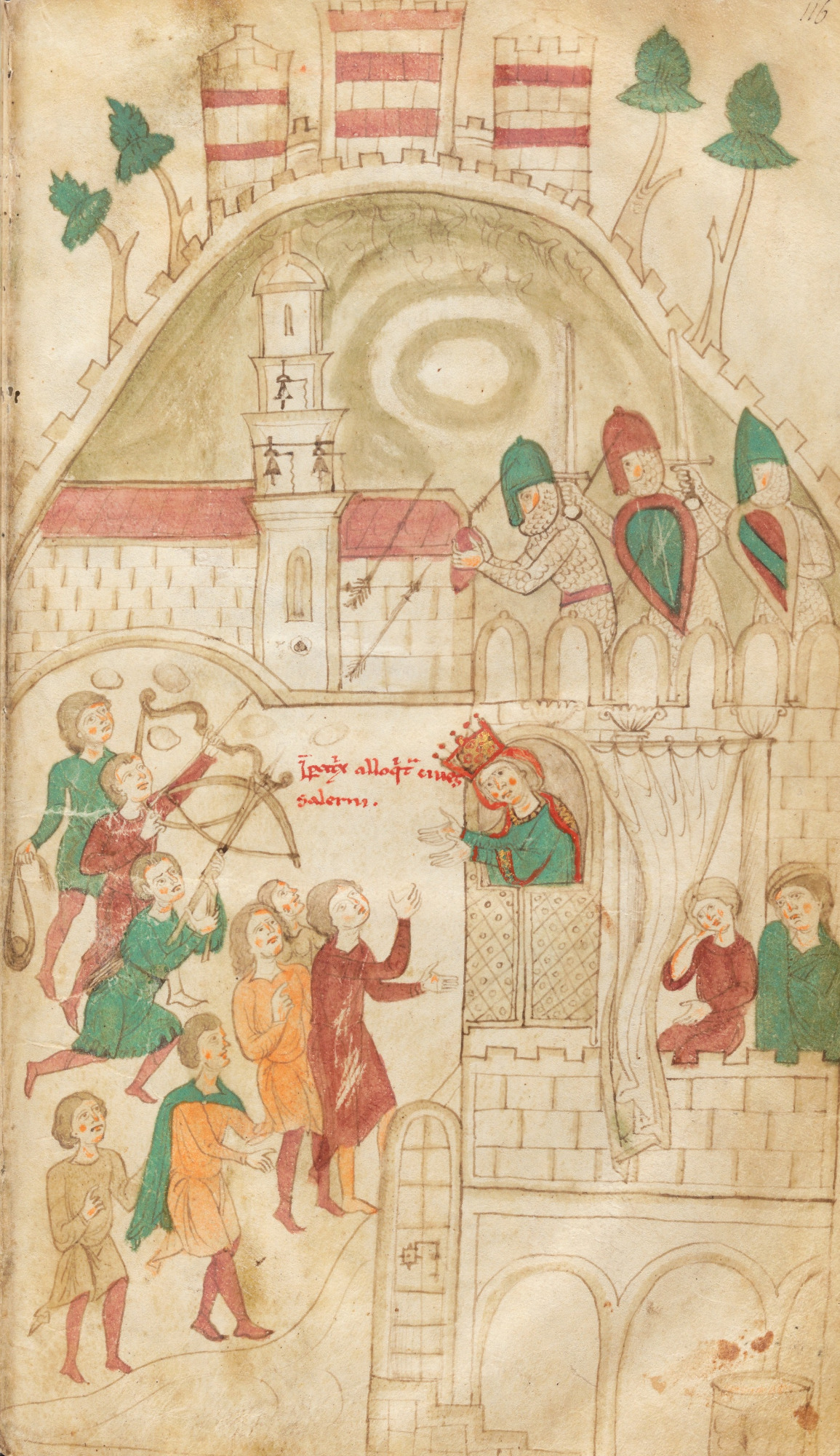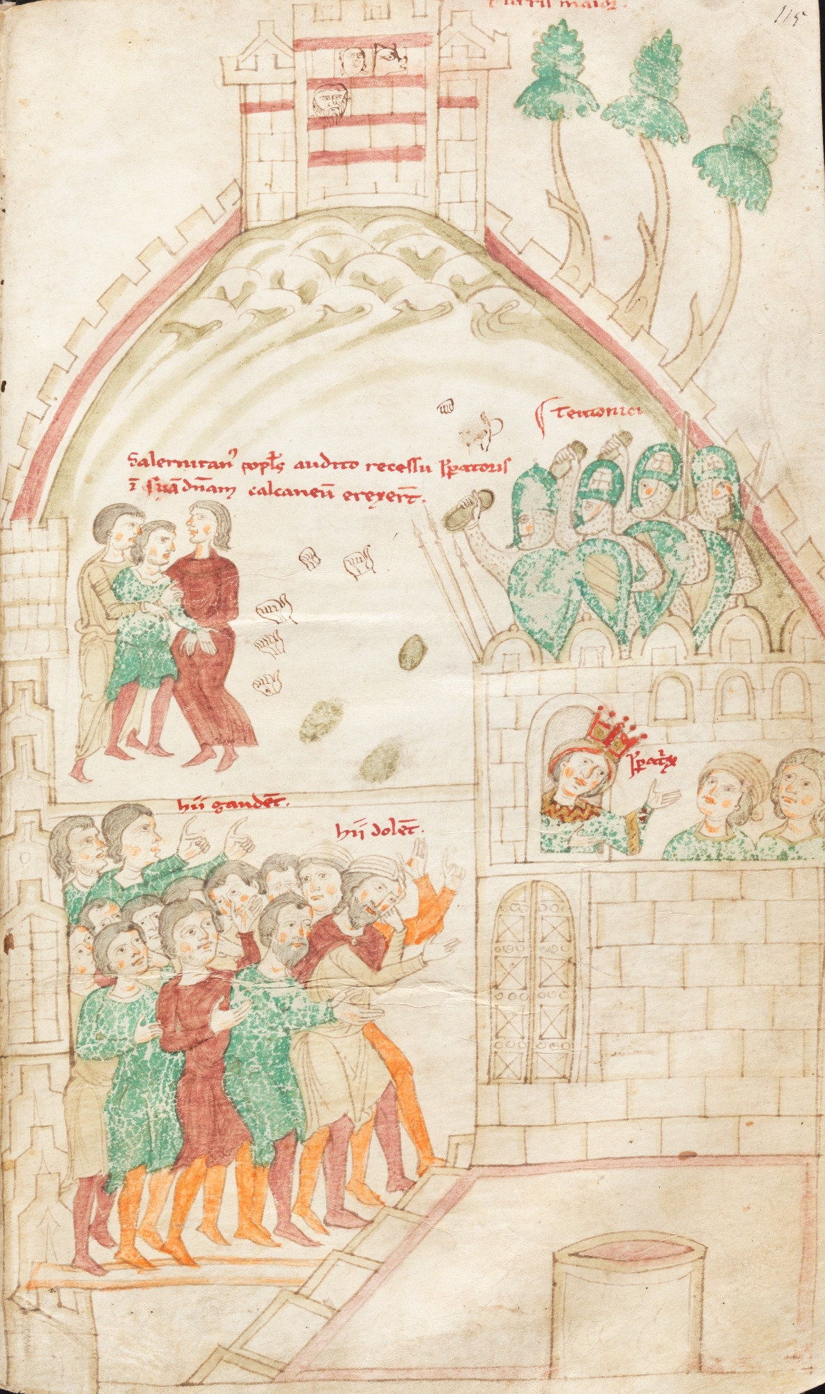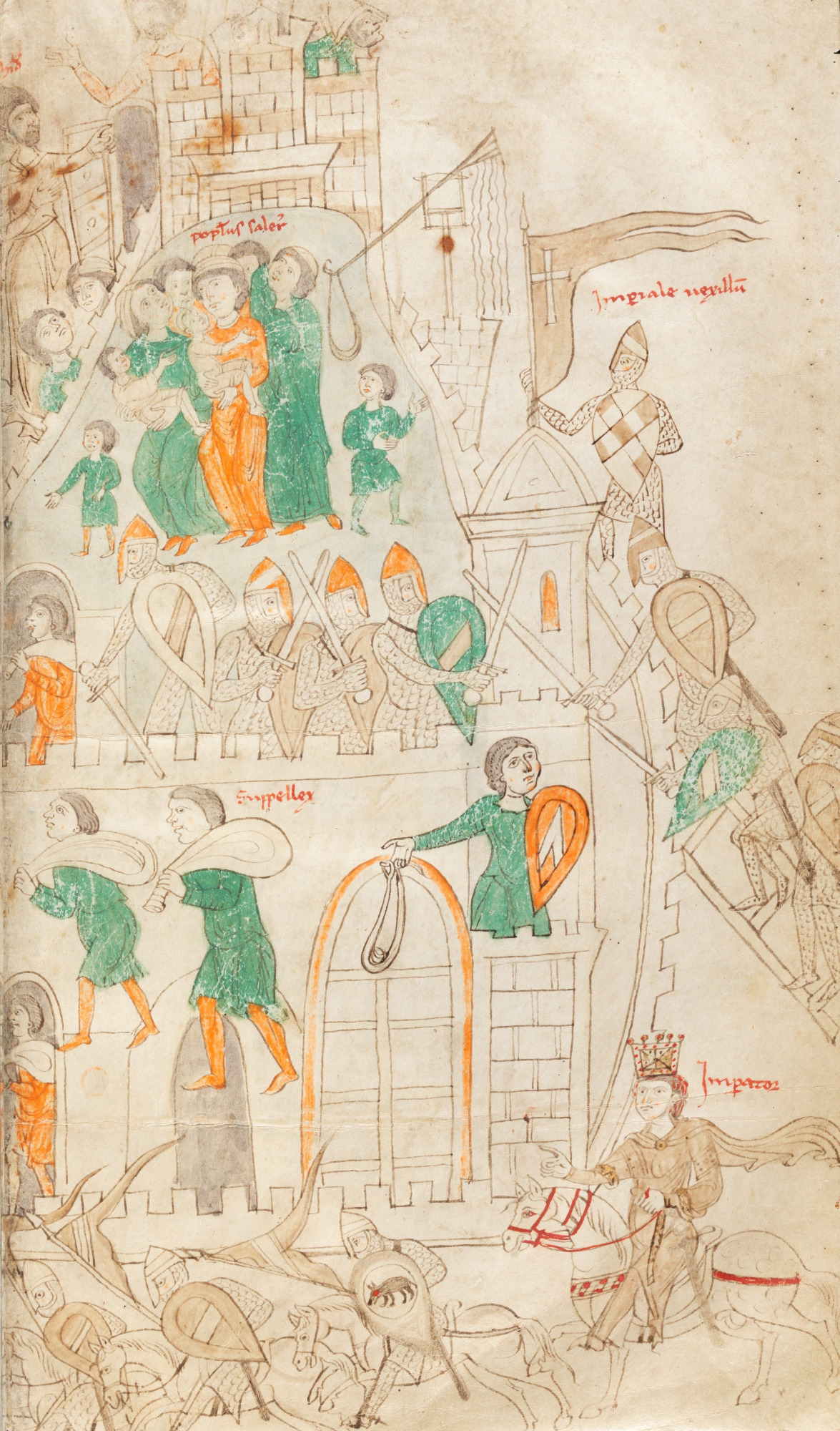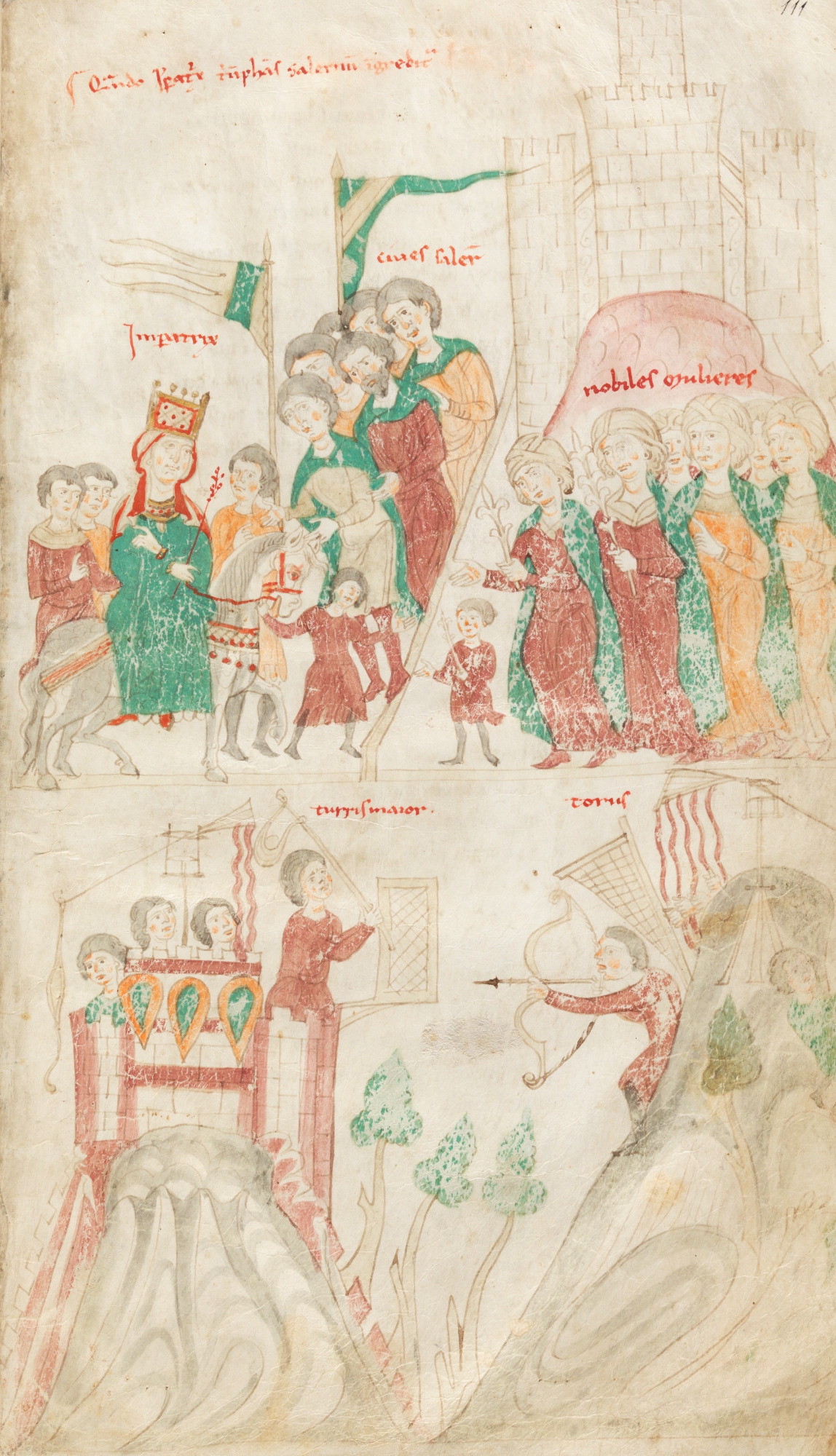 Die Miniaturen zeigen auch, wie Heinrich VI. später nach Salerno zurückkehrt, um die Schmach an der Kaiserin Konstanze zu rächen.