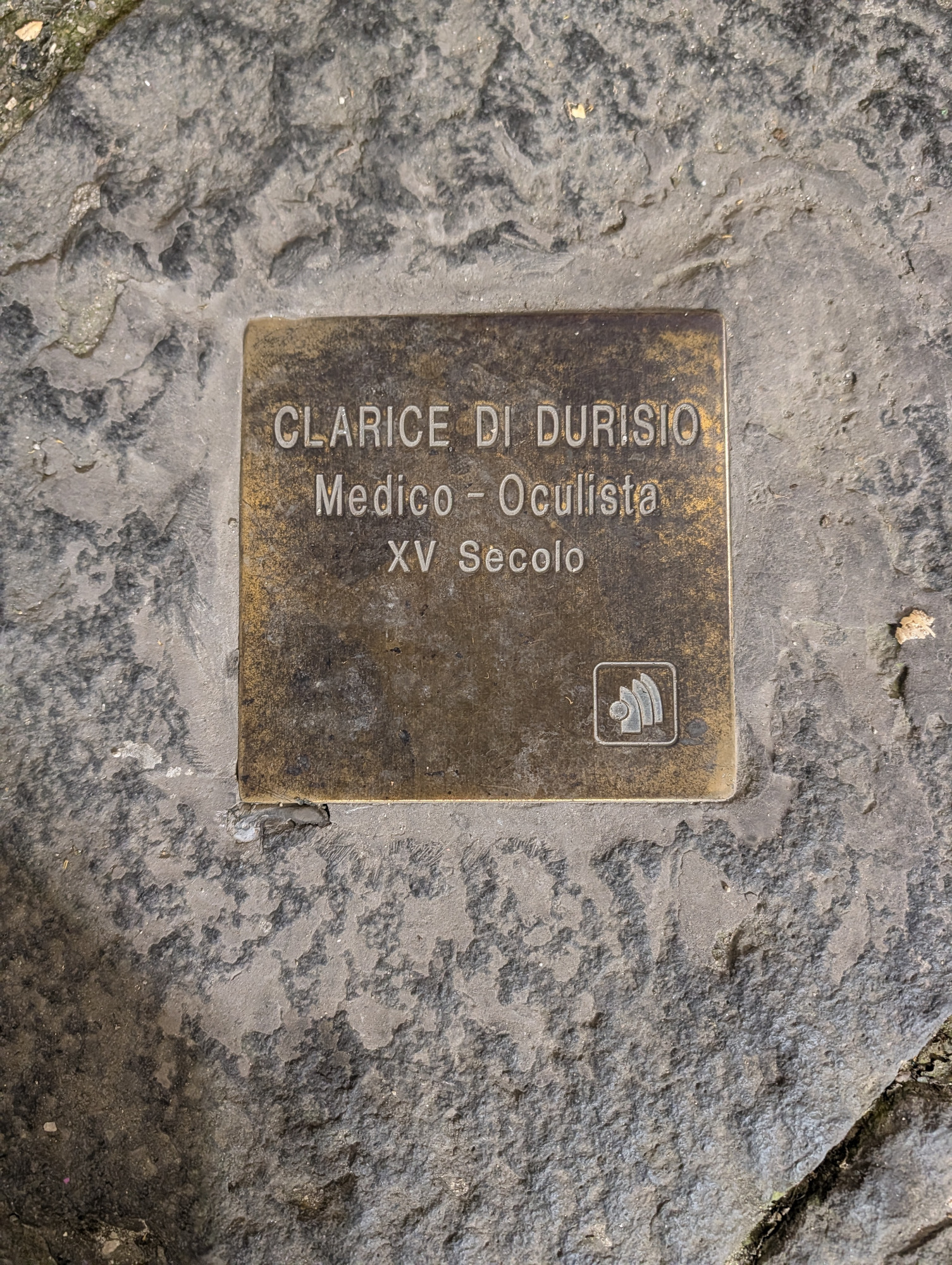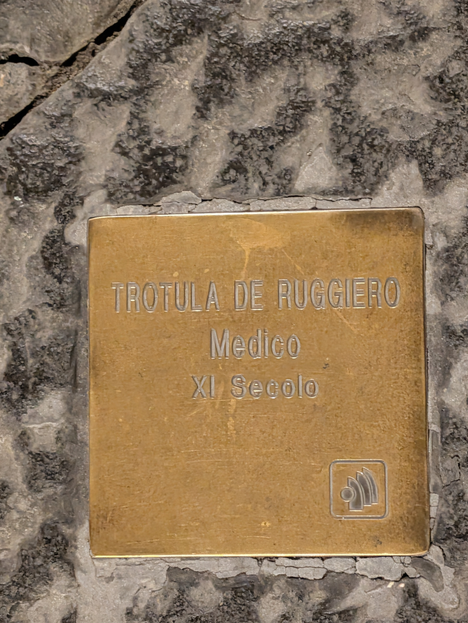 Auch Trotula de Ruggiero wird im Eingang zur Burg erinnert, als eine italienische Ärztin, die Seite an Seite mit Sichelgaita im elften Jahrhundert an der medizinischen Fakultät von Salerno tätig war. Ihr wird, wenn auch mit einiger Kontroverse, der Traktat "DE PASSIONIBUS MULIERUM ART IN ET POST PARTUM" zugeschrieben, der die Geburt der Geburtshilfe und Gynäkologie als medizinische Wissenschaft markiert.
